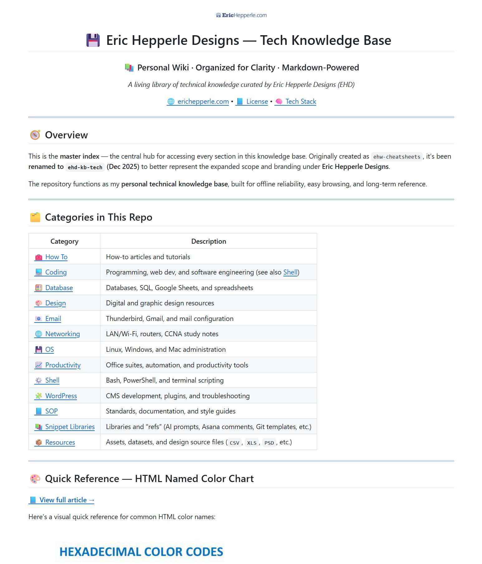 The ehd-kb-tech repo got a similar treatment with a branded overview, tech stack snapshot, quick-reference tables, and consolidated templates, prompts, and tools so everything lives where you’d expect it.